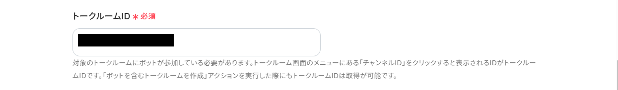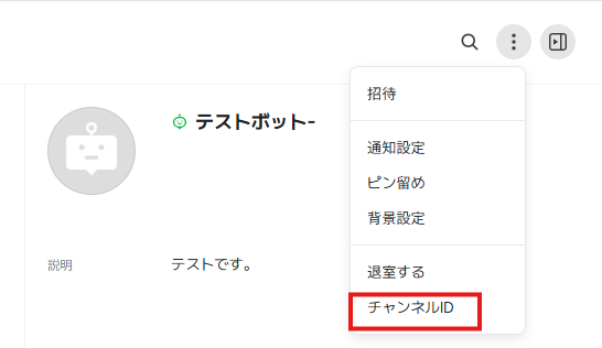 トークルームの右上にある三点リーダーをクリックし、チャンネルIDと表示されるIDをコピーし設定しましょう。