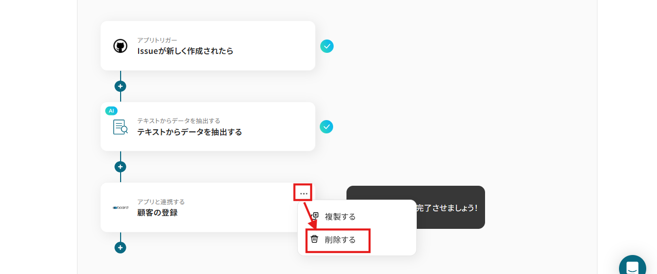 LINE WORKSの「トークルームにメッセージを送信」アクションの三点リーダーをクリックし、削除するを選択します。