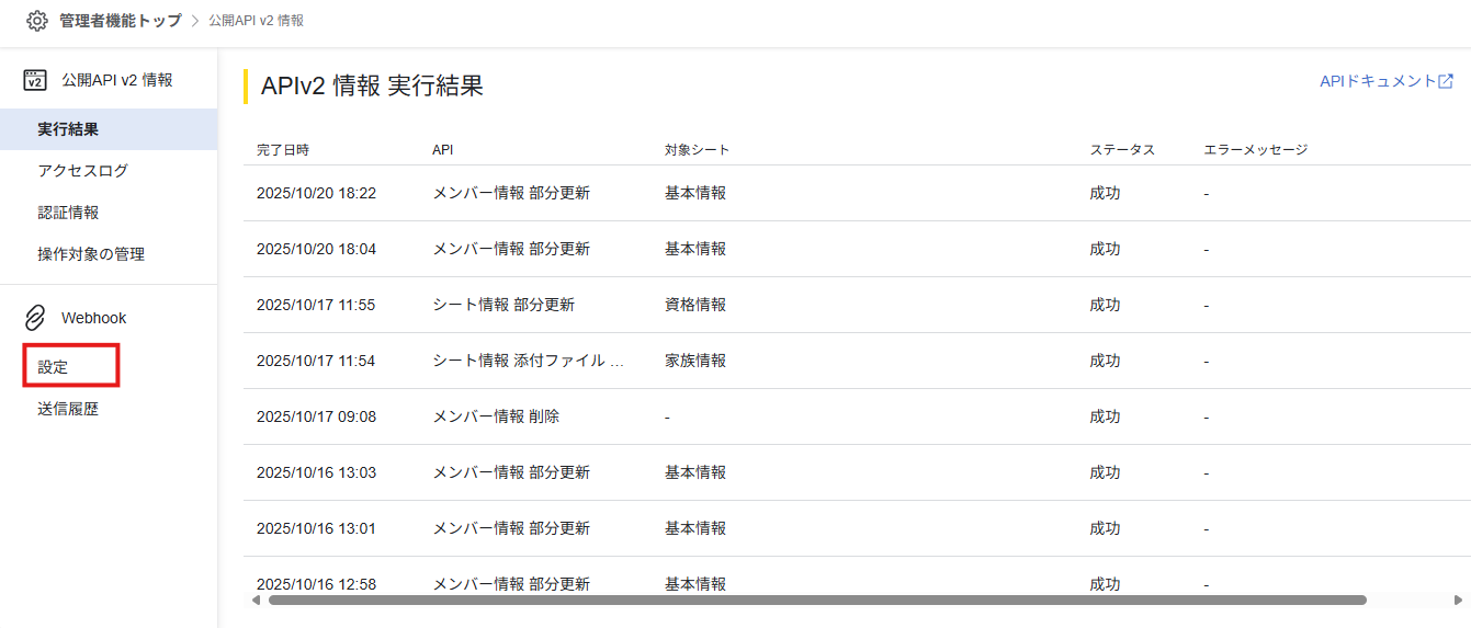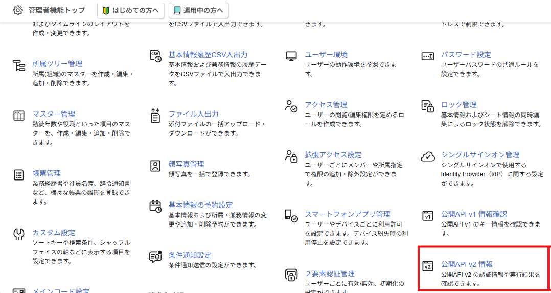 管理者メニューを開き、「公開API v2 情報」をクリックしてください。
