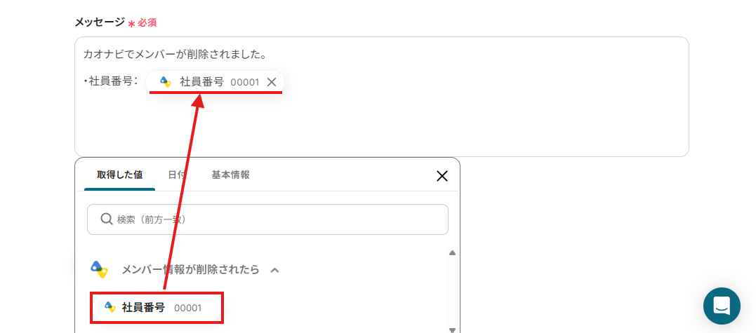 下記画面のように設定すると、カオナビでメンバーが削除されたら「社員番号」を取得し、LINE WORKSに自動でメッセージを送ることができますよ!
