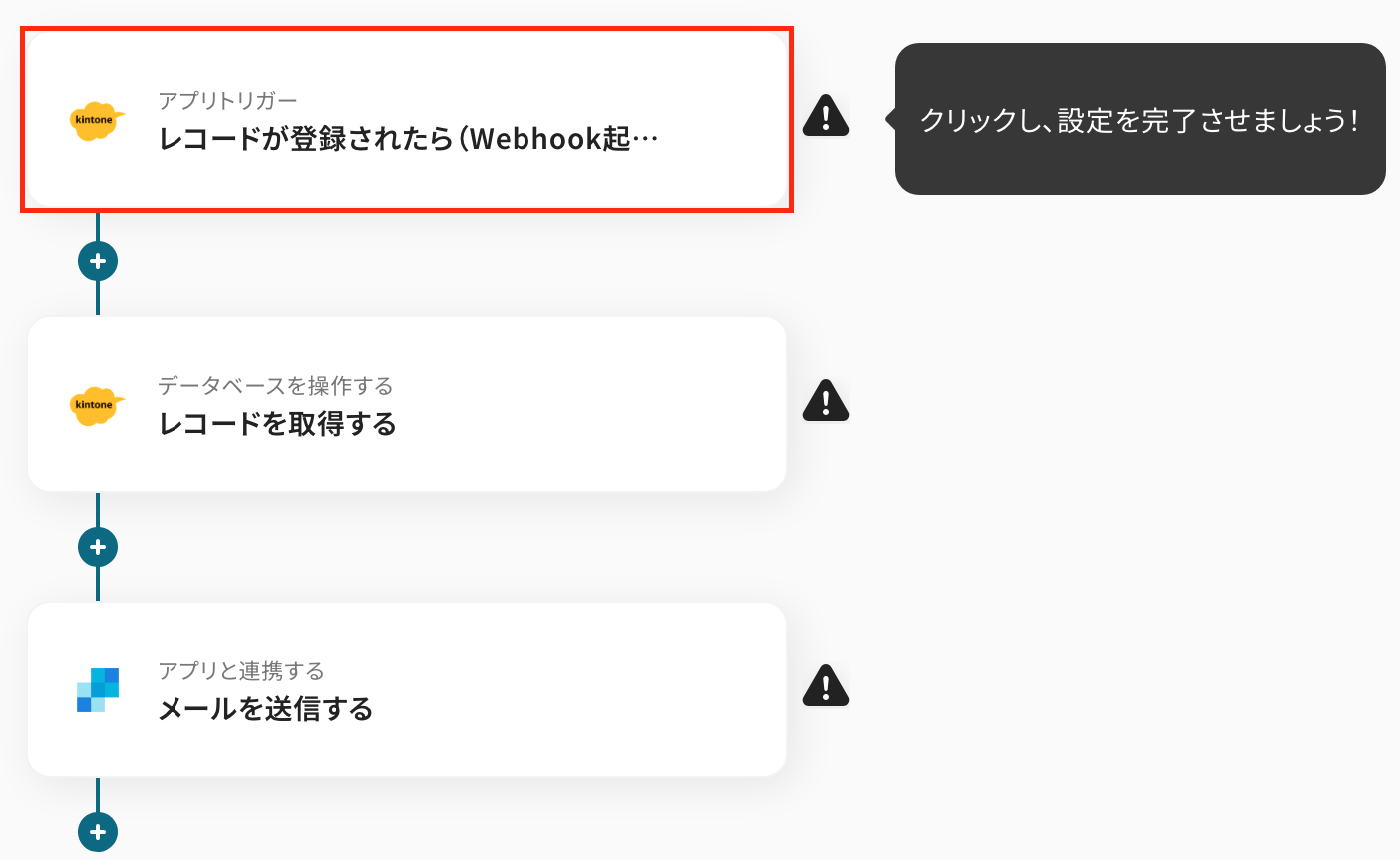 最初の設定です!ここからは、「kintoneにレコードが登録されたら、SendGridでメールを送信する」フローの設定をします。