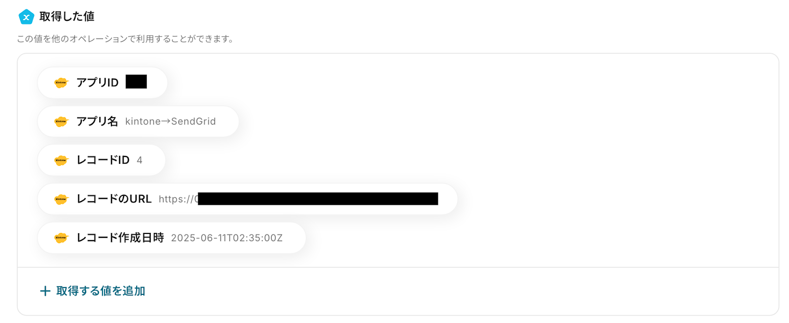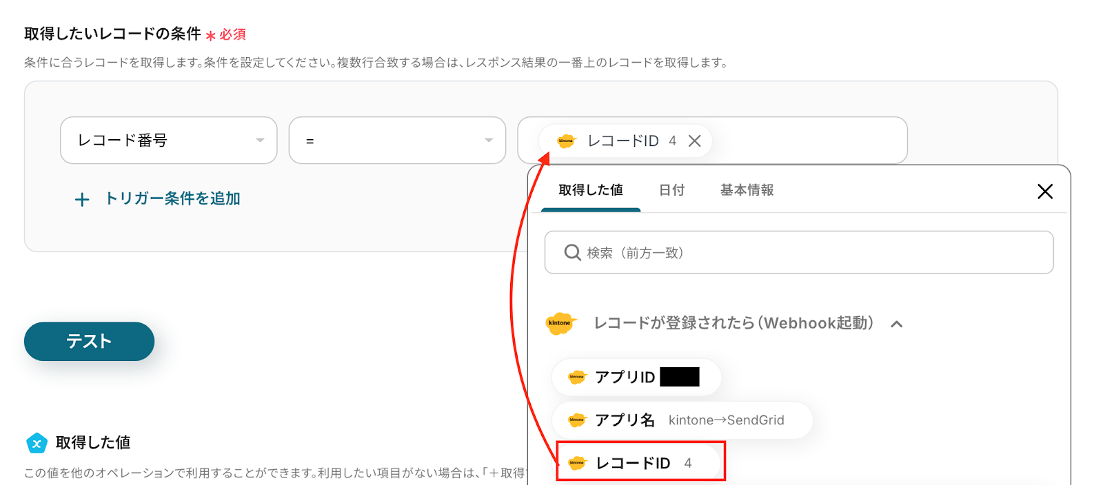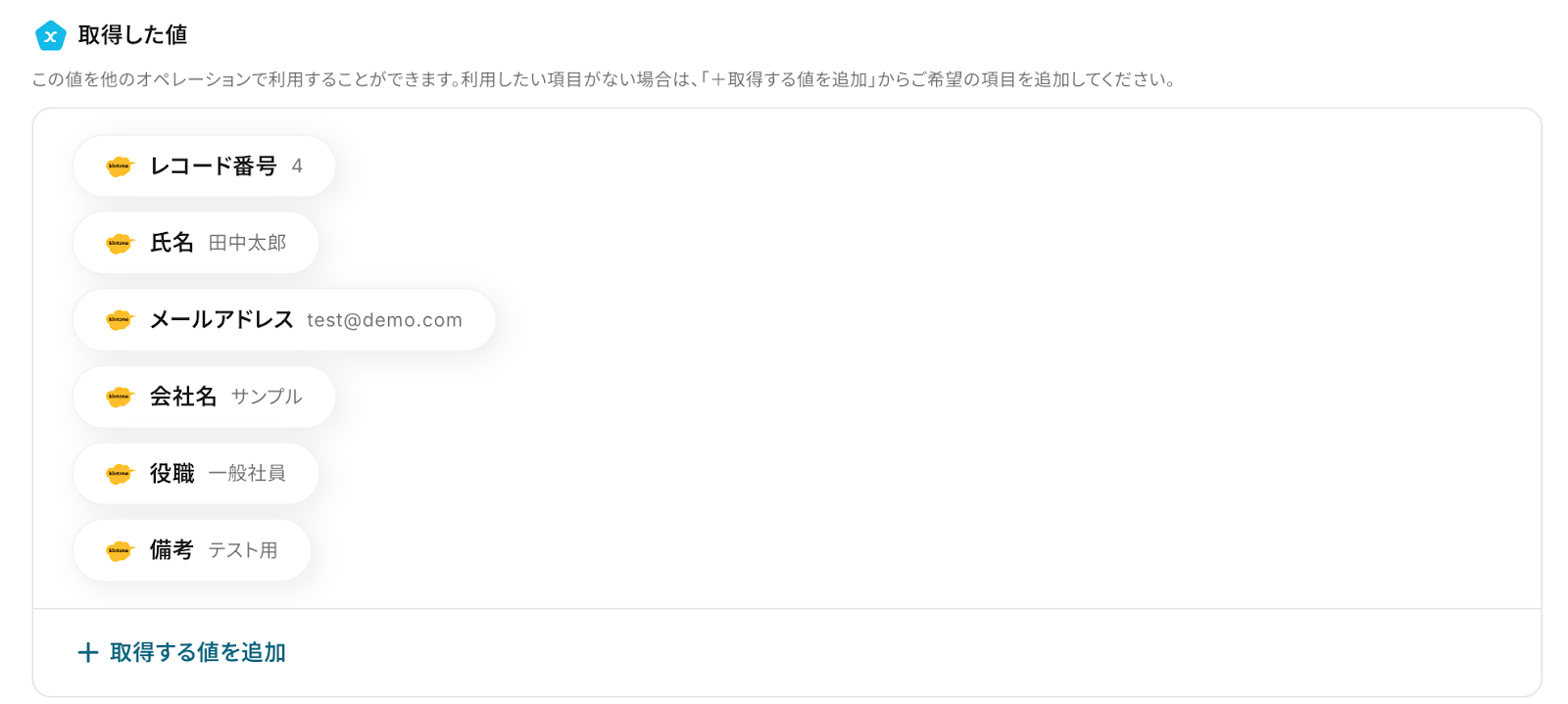 「テスト」をクリックし、先ほど追加したレコードの情報が「取得した値」にアウトプットとして抽出されることを確認しましょう。