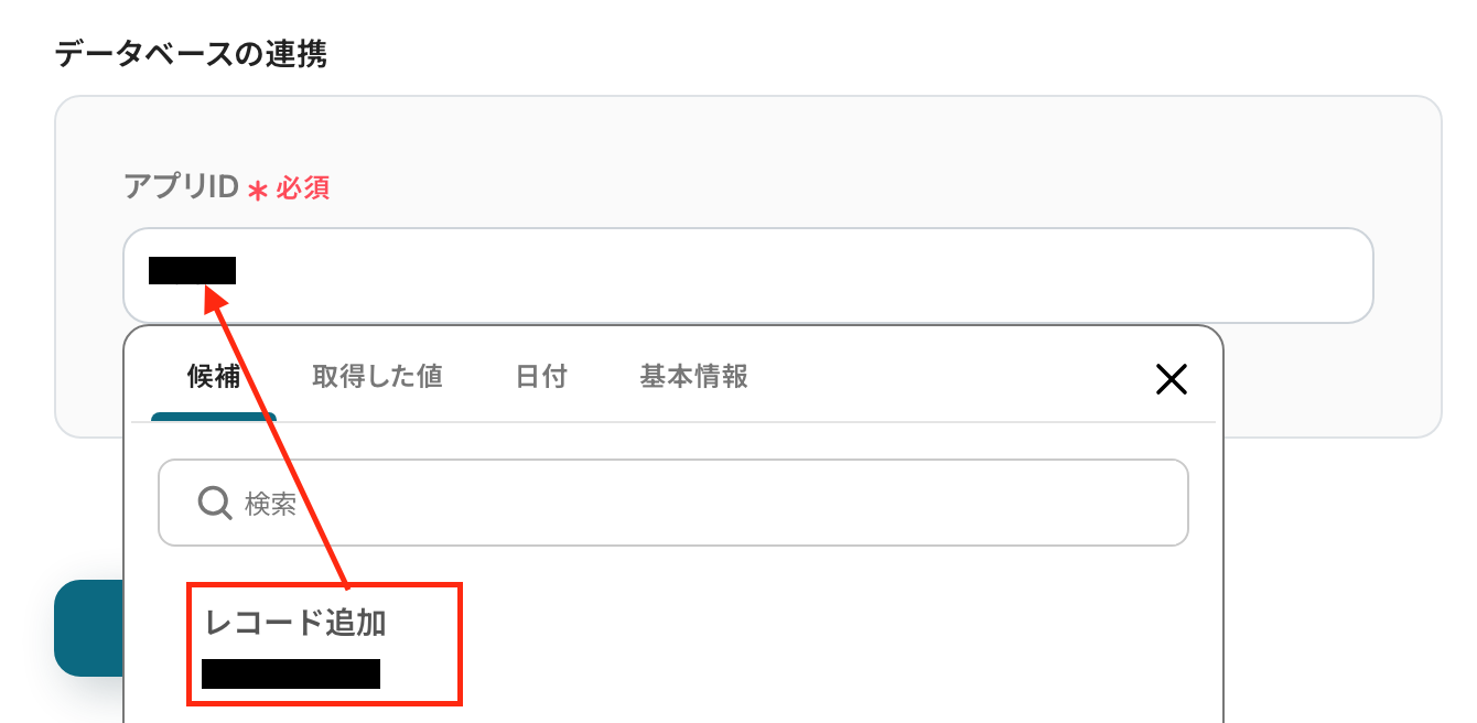 以下の赤枠をクリックしましょう!ここでは、先ほど追加したレコードの情報を取得する設定を行います。