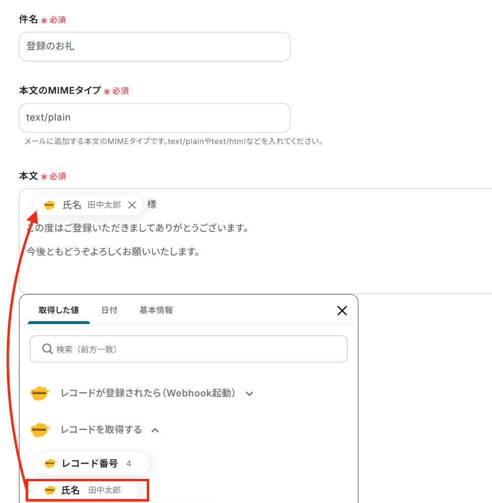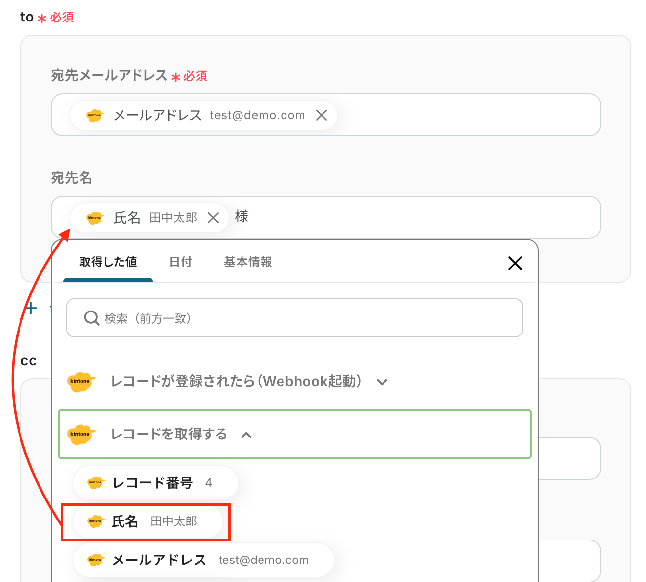 「to」の項目は、ボックスをクリックして表示される「取得した値」を引用して、設定してください。