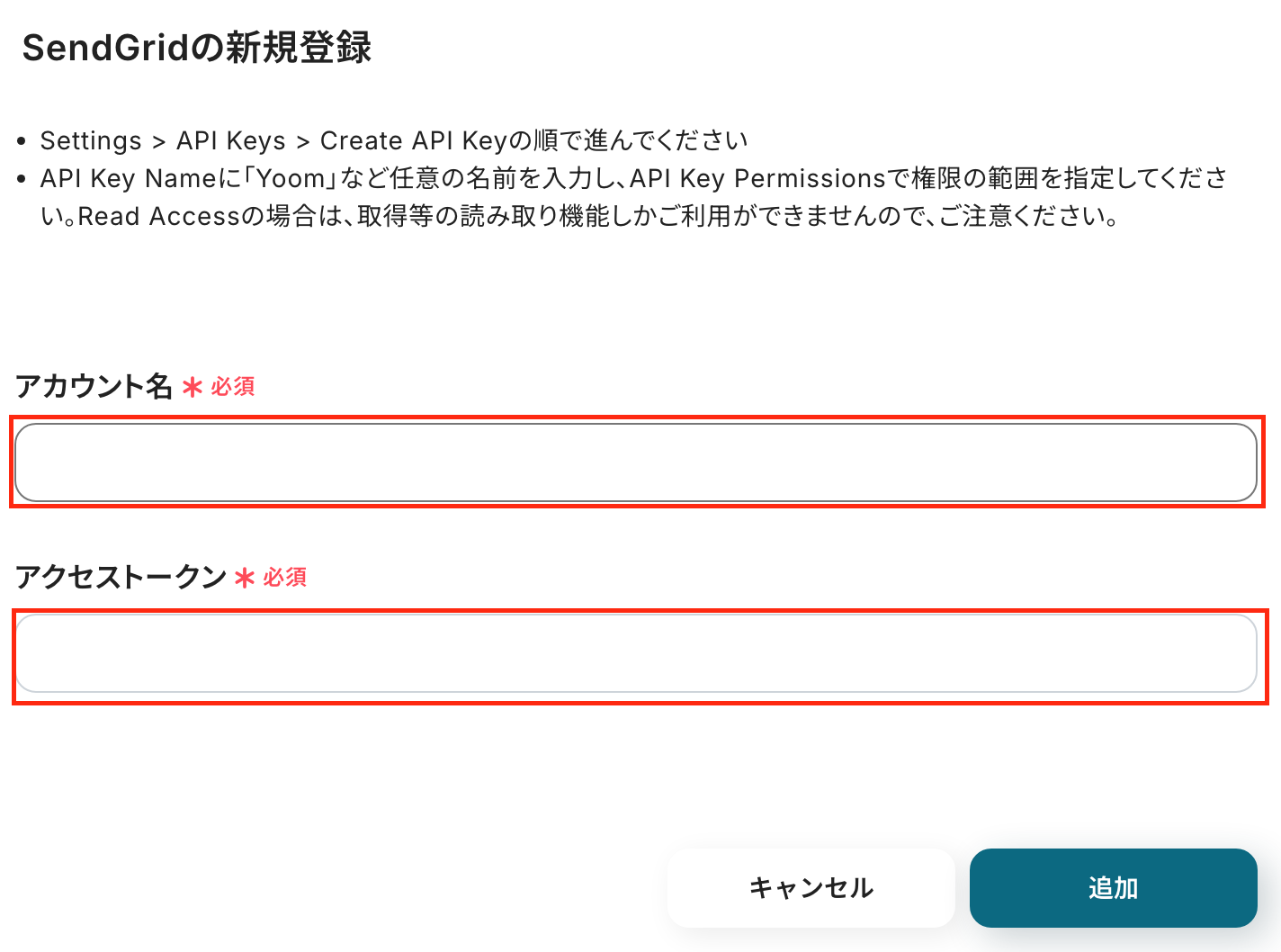 次の画面で、「アカウント名」「アクセストークン」を入力して、「追加」をクリックしましょう。