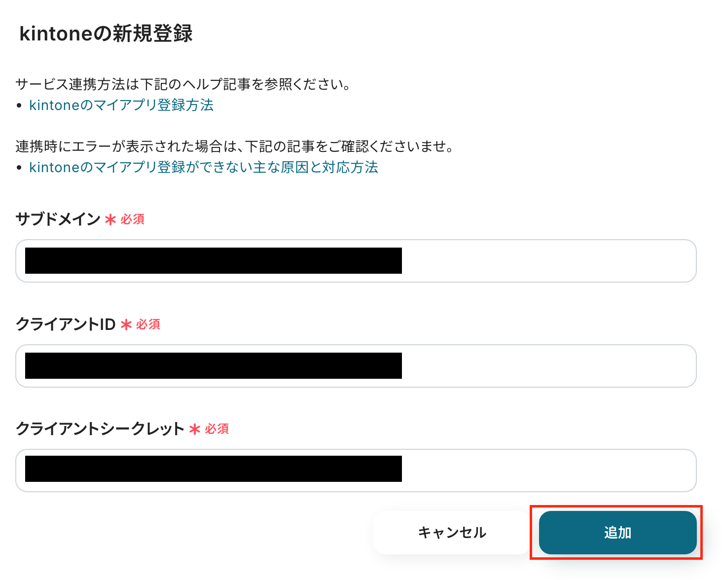 次の画面で、「サブドメイン」「クライアントID」「クライアントシークレット」を入力して、「追加」をクリックしましょう。