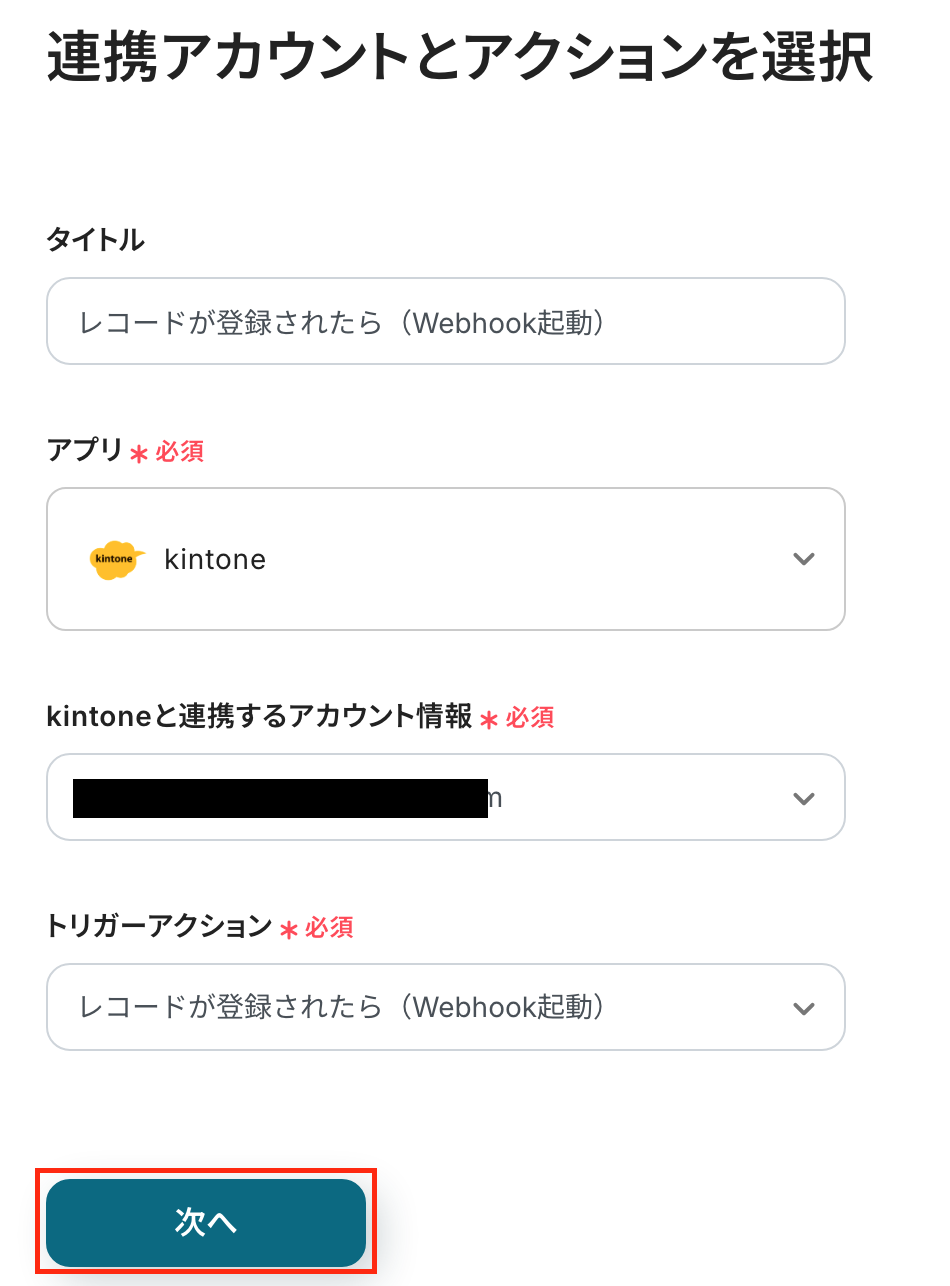 - アクション:「レコードが登録されたら(Webhook起動)」を選択