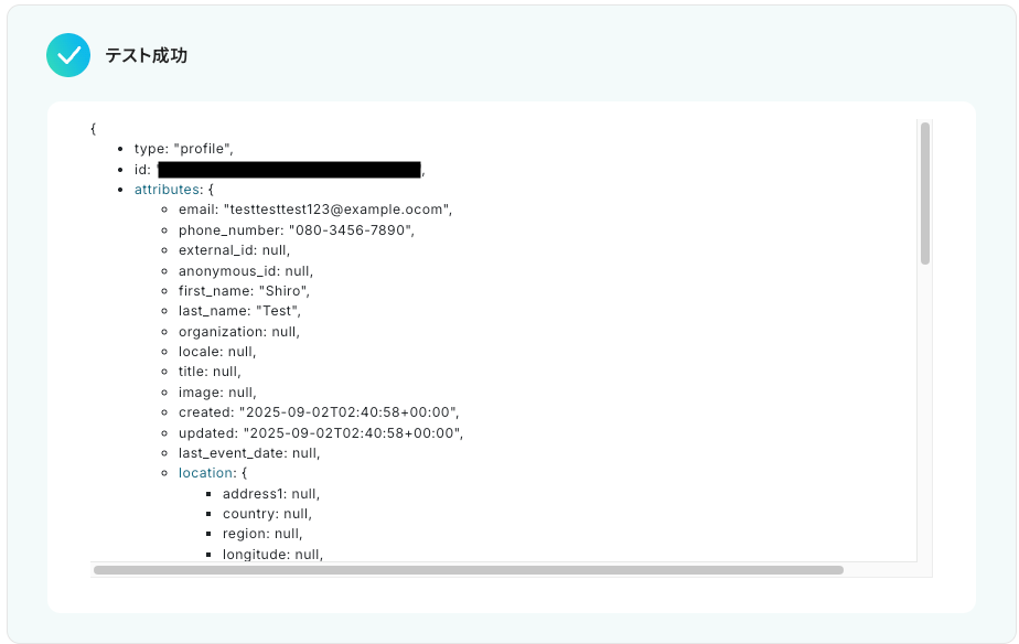 テストに成功すると、Klaviyoに作成されたプロフィールに関する情報が一覧で表示されます。