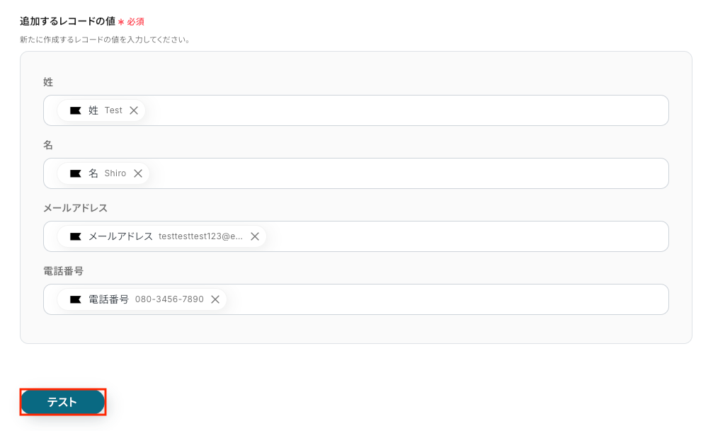入力が完了したら、設定内容とトリガーの動作を確認するため「テスト」をクリックします。
