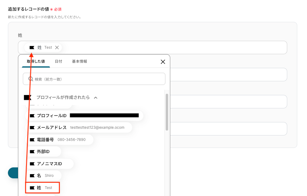 以下の画像の取得した値をもとに、Google スプレッドシートへレコードの追加が可能です。