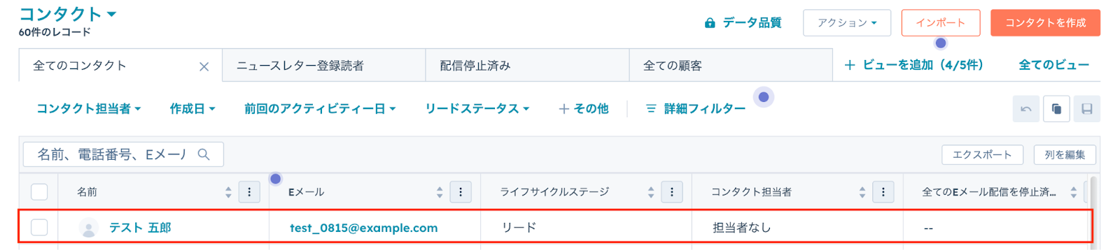 あわせて、HubSpotの画面を開き、指定した内容でコンタクトが実際に作成されているかを確認してみましょう。 今回は下記の通り作成されていました!