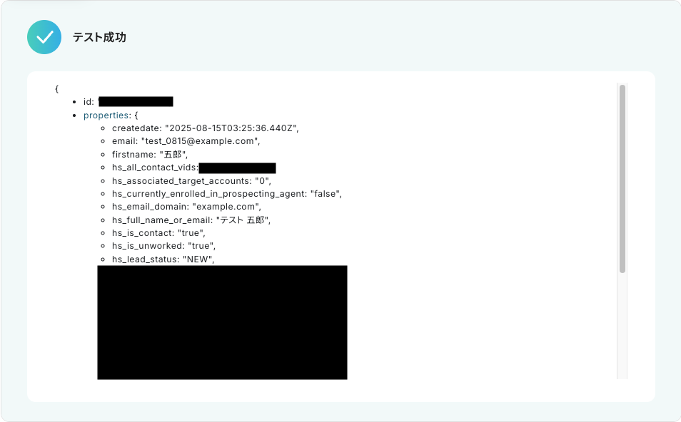 入力が完了したら「テスト」をクリックして、設定した内容でHubSpotにコンタクトが作成されるか確認しましょう。