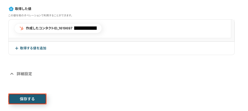 以下の画像の取得した値(=アウトプット )をもとに、HubSpotへ登録が可能です。