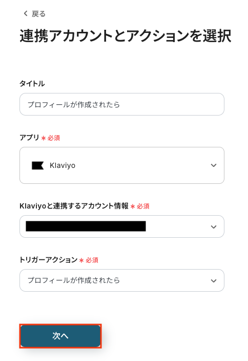 Klaviyoと連携するアカウント情報に問題がなければ、「次へ」をクリックします。