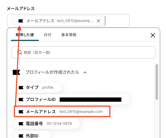 メールアドレス 入力欄をクリックすると、前のステップでKlaviyoから取得済みのアウトプットが表示されるので、選択して入力しましょう。 アウトプットを活用することで、値が固定化されず、毎回最新の情報を反映できます。