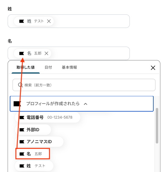 姓、名 こちらもメールアドレスと同様に、入力欄をクリックすると、取得済みのアウトプットが表示されるので選択して入力が可能です。