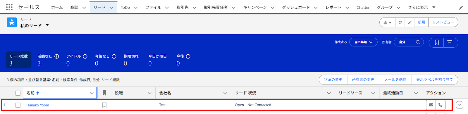 テストが成功すると、Salesforceにリードが作成されるので確認しましょう。