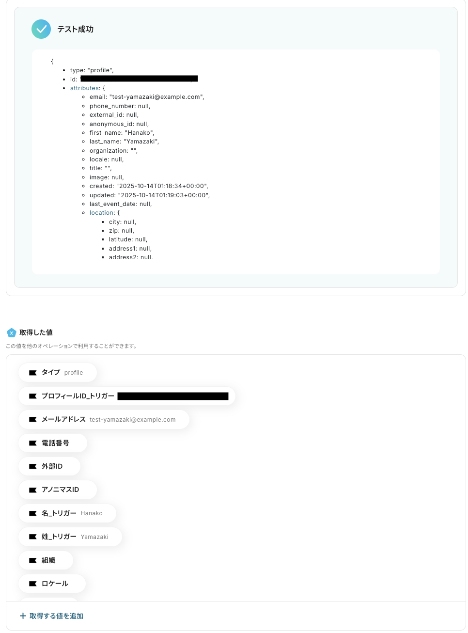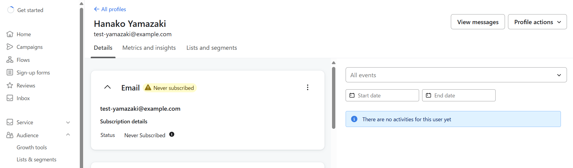 テストに成功すると、Klaviyoに作成されたプロフィールに関する情報が一覧で表示されます。