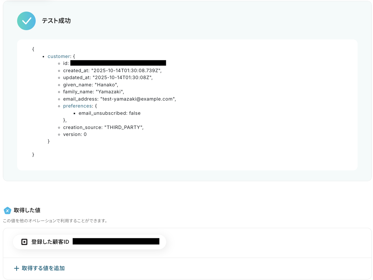 なお、テキストを直接入力した部分は固定値とされるため、取得した値を活用せず設定を行うと毎回同じデータがSquareに登録されてしまうので注意が必要です。