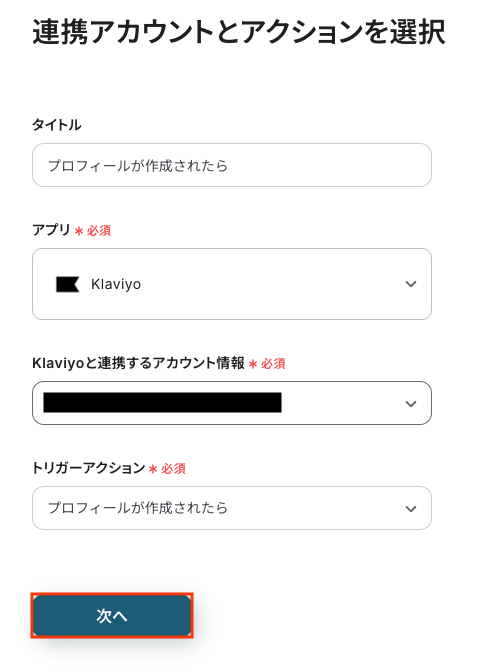 Klaviyoと連携するアカウント情報に問題がなければ、「次へ」をクリックします。