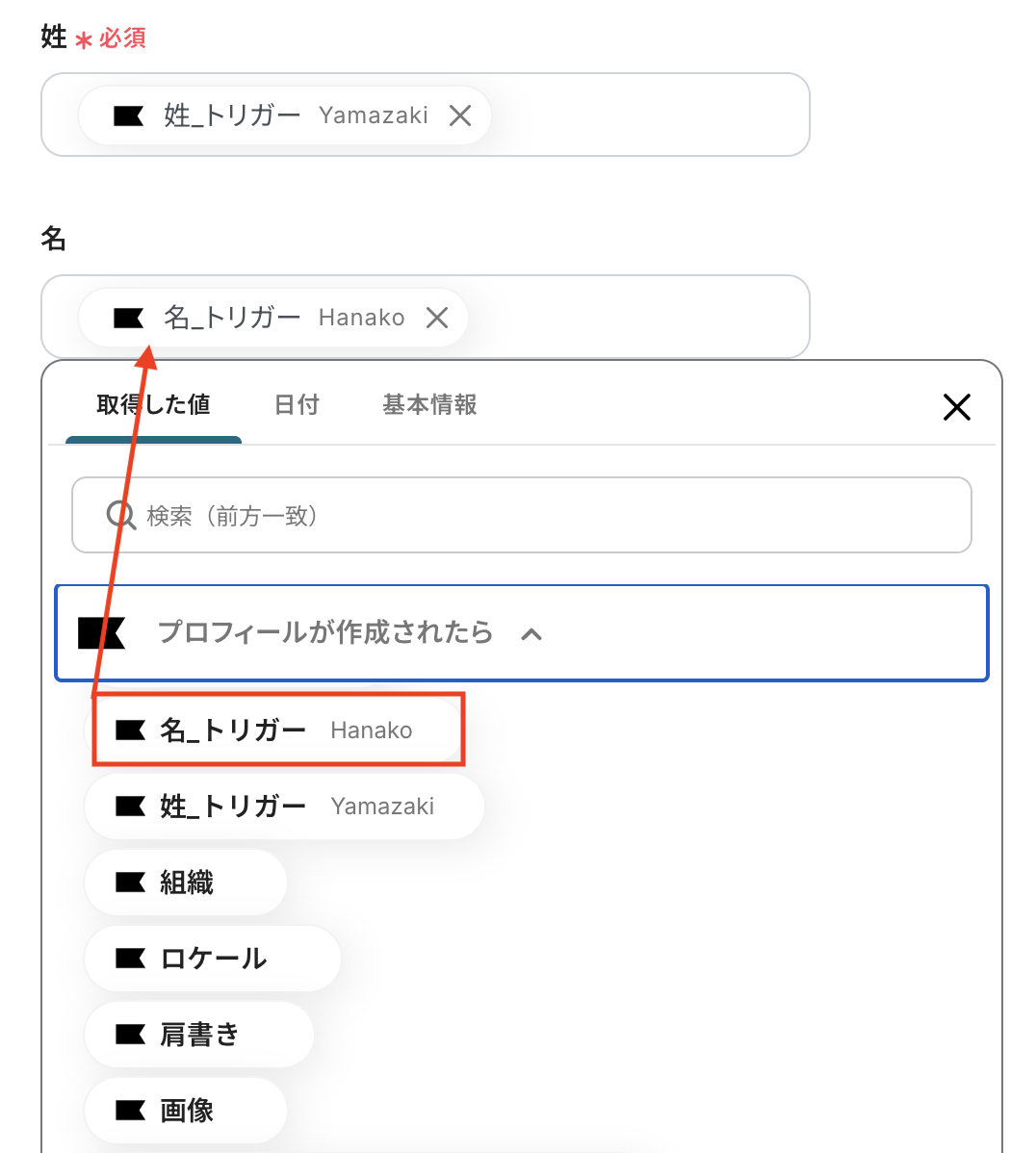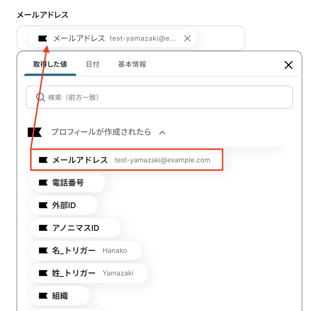 間違えて消してしまった場合など、該当欄をクリックすると取得した値が表示されるので、対応する値をマッピングしてください。