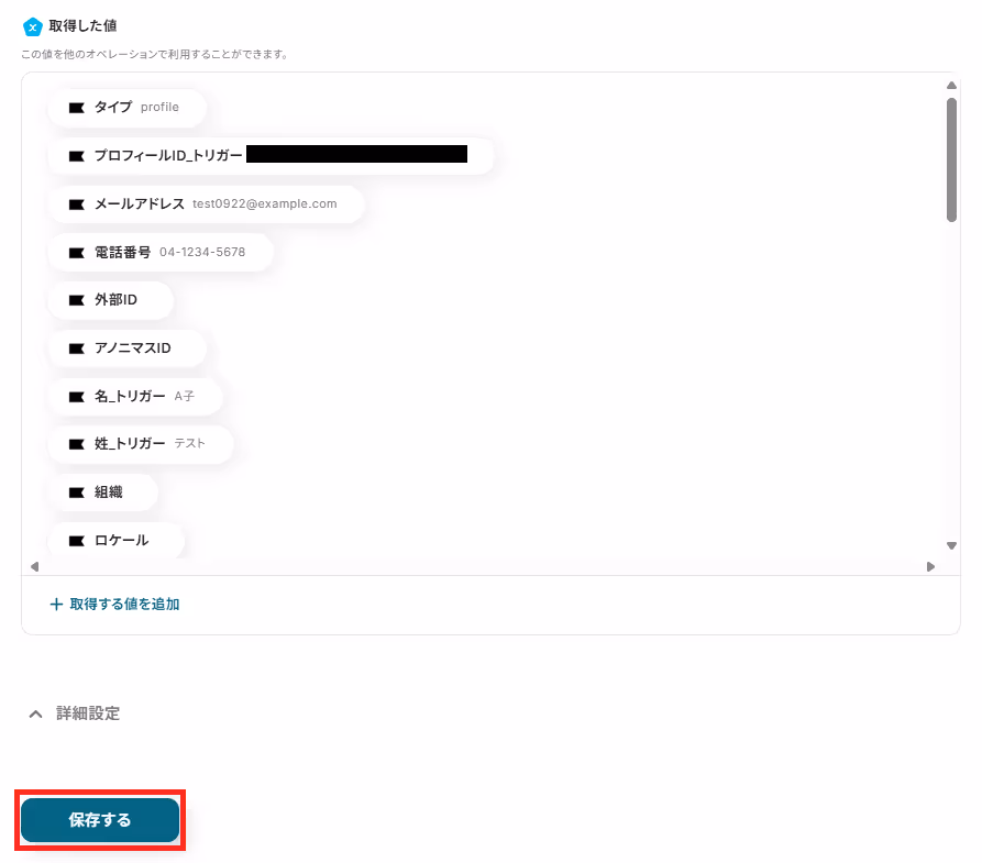 テスト成功画面と、取得した値が表示されました。確認したら「保存する」をクリックしましょう。