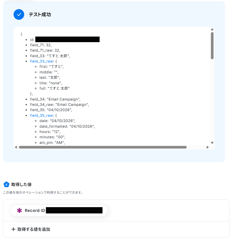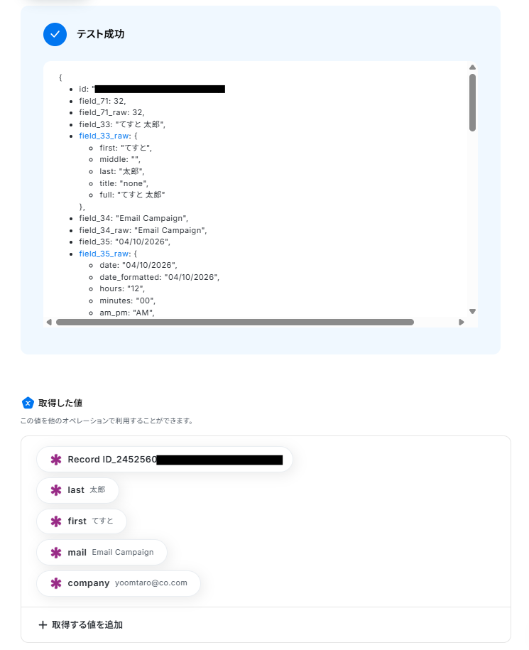 Yoomに戻り、「テスト」をクリックします。 テストに成功すると、「取得した値」に情報が追加されます。 ※取得した値とは 設定時の「テスト」で取得した値のことです。後続ステップの入力値として利用でき、実行のたびに最新の内容に更新(変動)されます。テストの重要性:「取得した値」のテスト値について 内容が確認できたら、「完了」をクリックします。