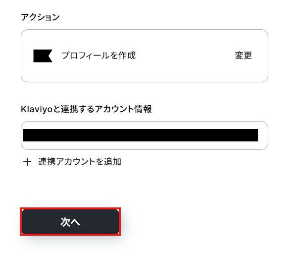 ステップ5:Klaviyoへプロフィールを作成する設定 次にKlaviyoへプロフィールを作成するアクションを設定していきます。