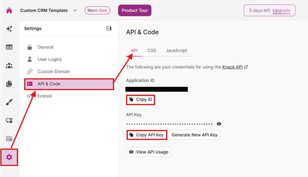 Knackにログインしたら、設定から「API&Code」→「JavaScript」を選択します。
