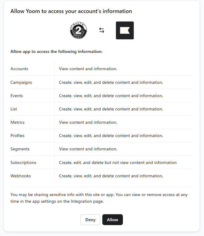 Klaviyoのアカウント情報へのアクセス許可の確認画面が表示されるので、「Allow」をクリックします。