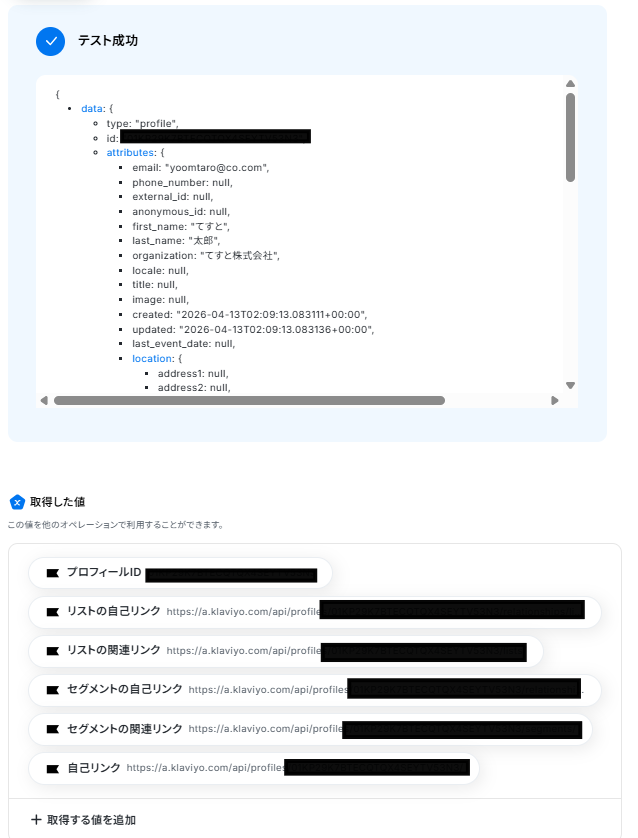 Klaviyoの「プロフィールを更新」アクションでは、更新対象のプロフィールIDを任意で設定し、前段の「プロフィールを検索」オペレーションで取得した情報を組み込めます。 ■注意事項
