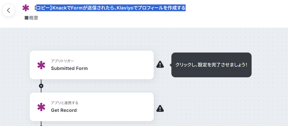 はじめに、KnackとKlaviyoをYoomと連携します。 次に、トリガーでKnackを選択し、「Submitted Form」というアクションを設定します。 次に、オペレーションでKnackの「Get Record」アクションを設定し、送信されたフォームの内容を取得します。 最後に、オペレーションでKlaviyoの「プロフィールを作成」アクションを設定し、取得した情報をもとにプロフィールを作成します。 ※「トリガー」:フロー起動のきっかけとなるアクション、「オペレーション」:トリガー起動後、フロー内で処理を行うアクション■このワークフローのカスタムポイント