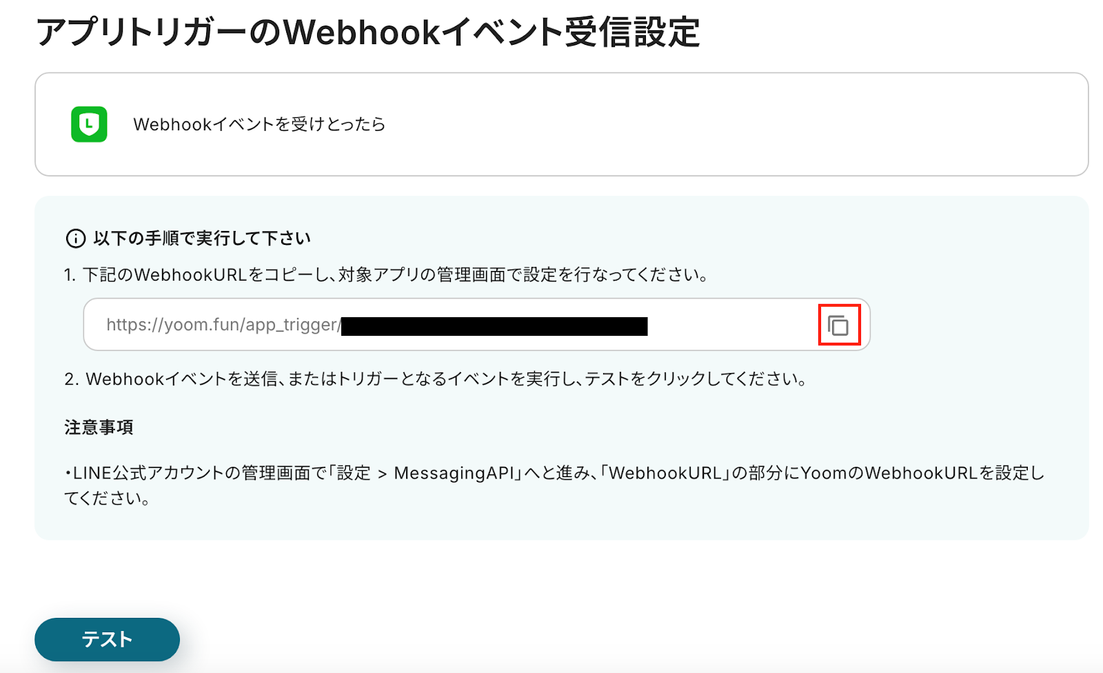 送信後、Yoomの画面に戻り「テスト」をクリックします。