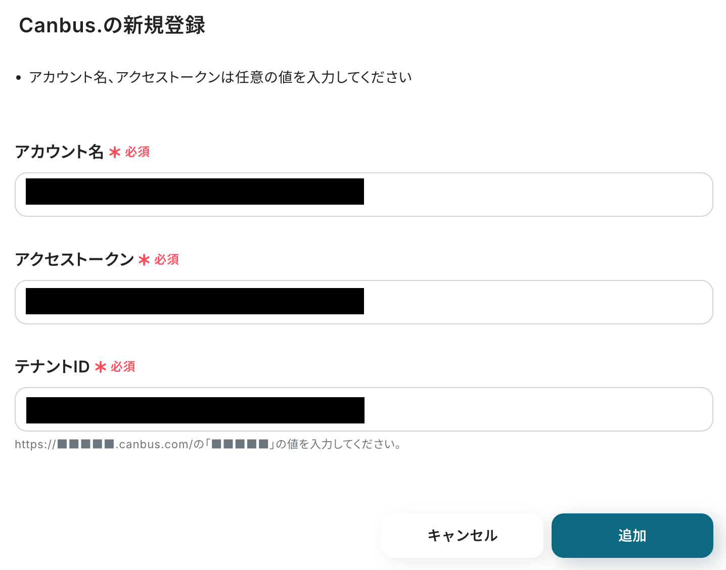 「Canbus.の新規登録」画面で、以下の必須項目を入力して「追加」を押します。