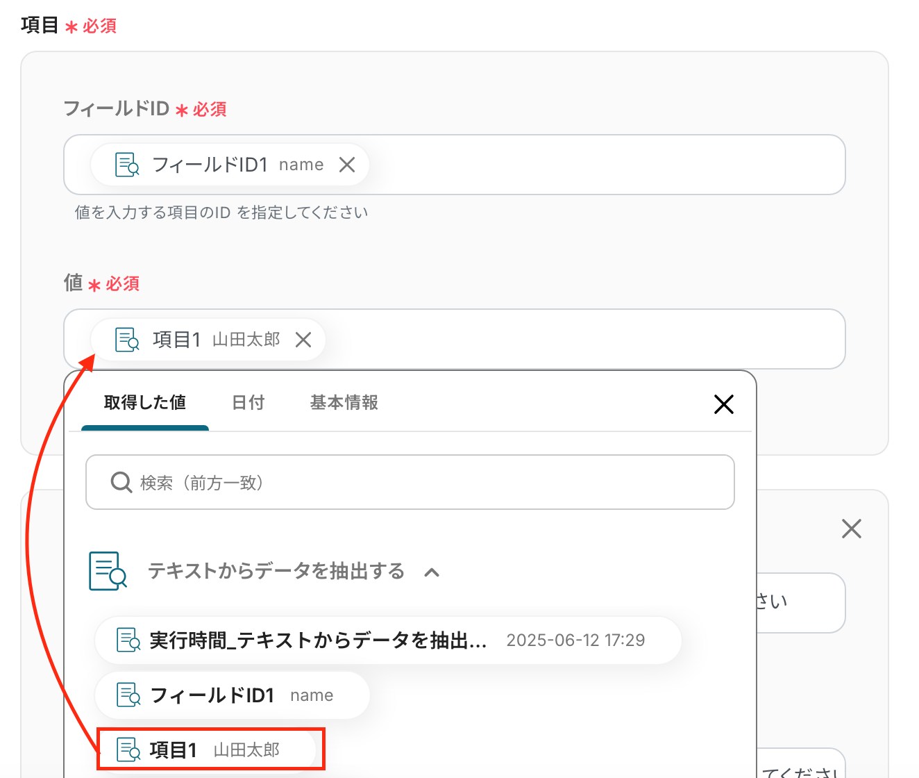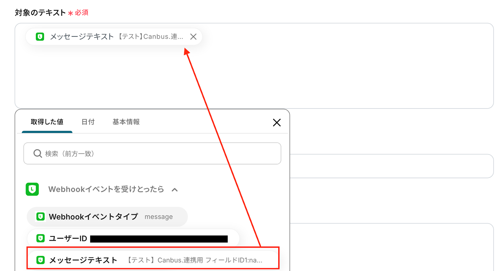 「対象のテキスト」:ボックスをクリックして表示される「取得した値」から設定。