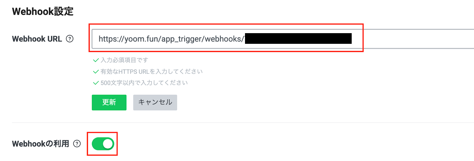 「成功」と表示されたら、Webhookの利用のトグルをONにしてください。
