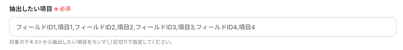 「抽出したい項目」:対象のテキストから抽出したい項目をカンマ(,)で区切り、指定。
