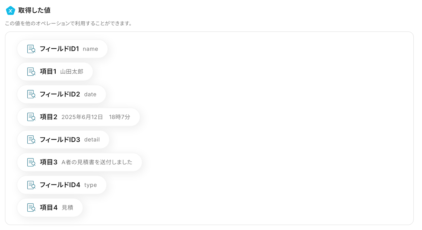 チャットに送信した内容を取得できたら確認をしてください。このアウトプットは、次の設定で活用します。