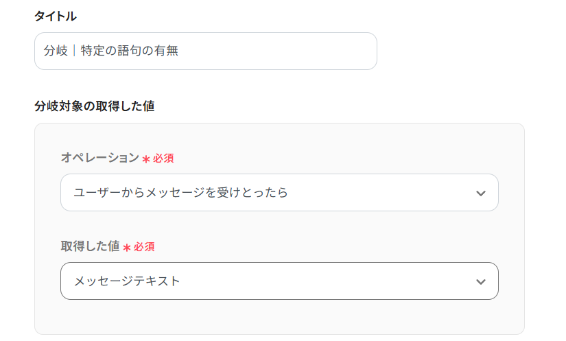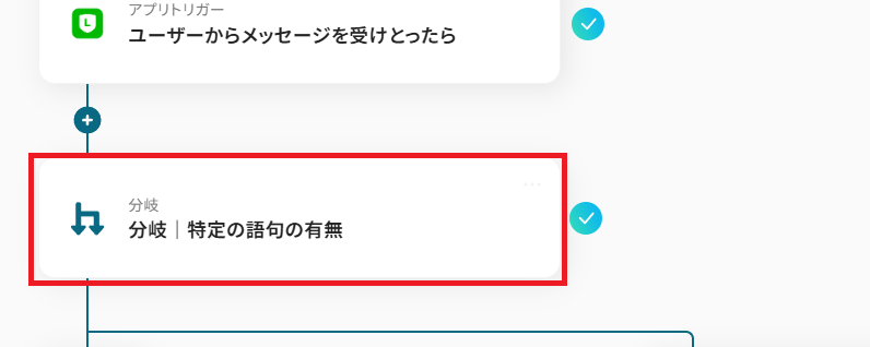 - 次に、オペレーションで分岐機能を設定し、特定のキーワードが含まれるなど、条件に合致したメッセージの場合のみ後続の処理に進むようにします