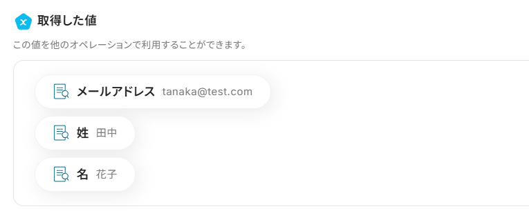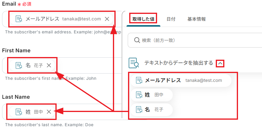 - 「テキスト抽出」のオペレーションでは、boardから取得した顧客情報のうち、Dripへ連携したい項目を任意で設定してください。