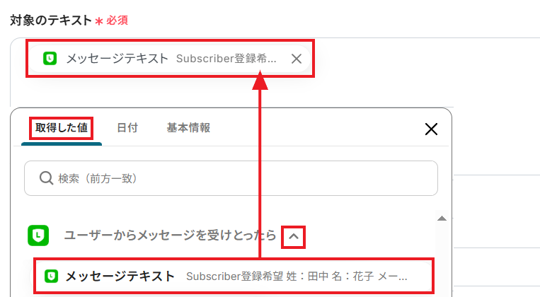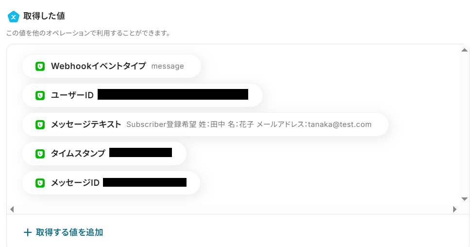 - Field Value:手入力による固定値や、LINE公式アカウント等から取得した値を入力