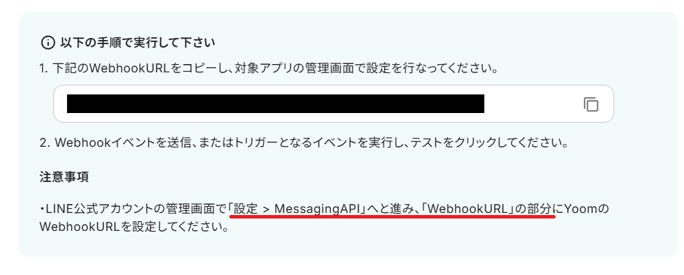 Yoomに表示されたWebhookURLを、LINE公式アカウントの管理画面にペーストします。