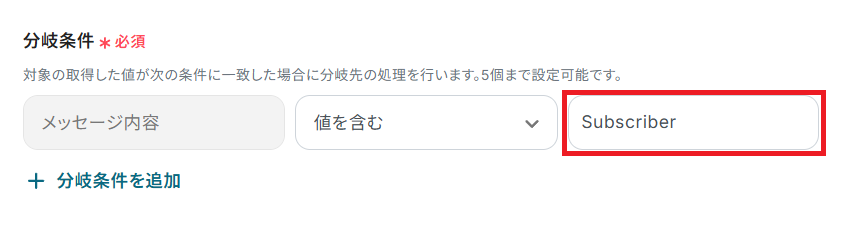 - 分岐機能では、フローを作動させる条件として、特定のキーワードや正規表現などを自由に設定することが可能です