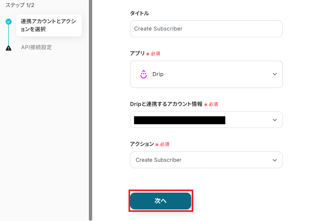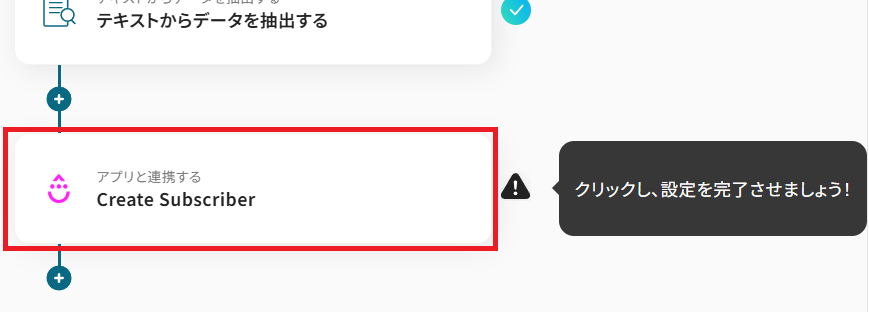 - 最後に、Dripの「Create Subscriber」アクションを設定し、抽出した情報をもとに新しいSubscriberを作成します