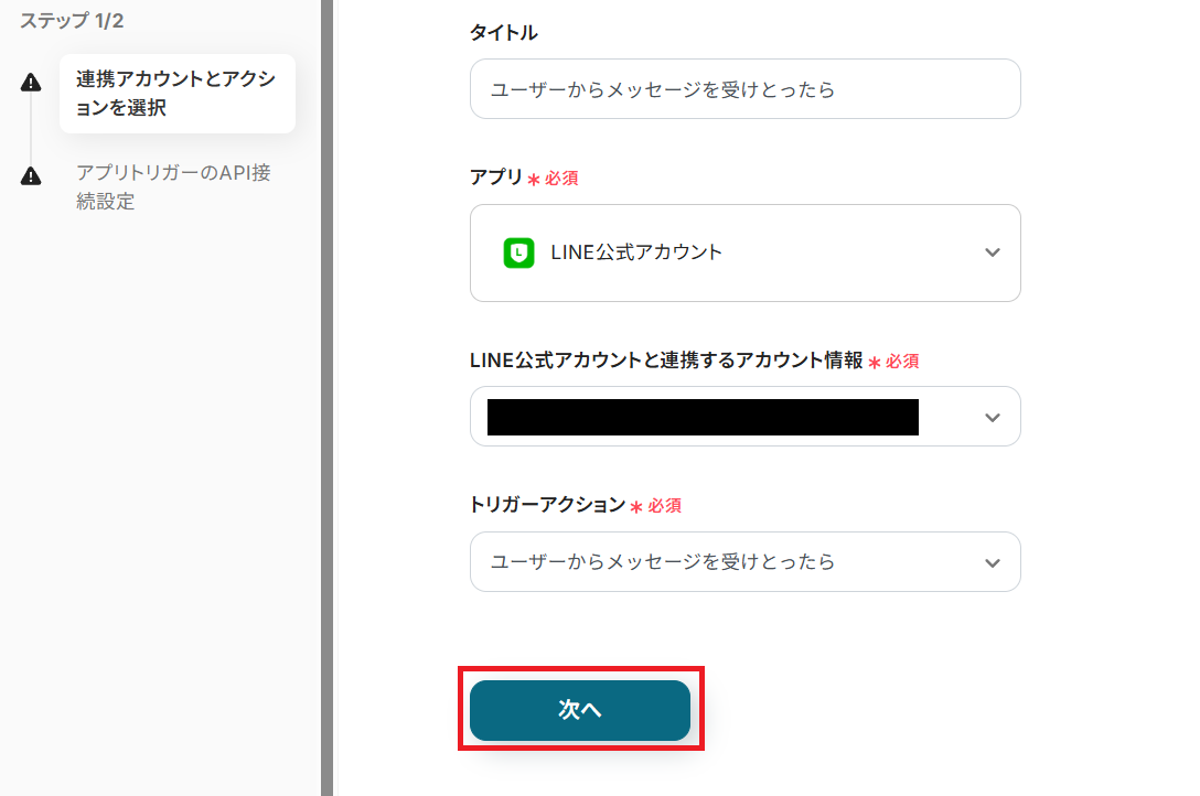 タイトルを任意で設定し、LINE公式アカウントと連携するアカウントやアクション内容を確認したら「次へ」を押してください。