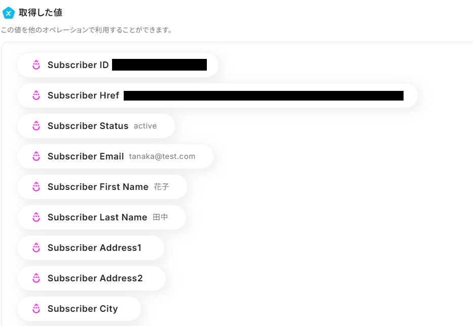 - Dripの「Update Subscriber」アクションでは、更新対象のSubscriber情報や更新したい内容を、前のオペレーションで取得した値と紐づけて設定してください。
