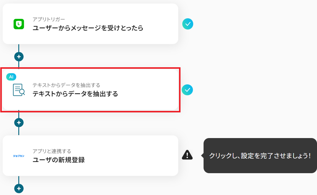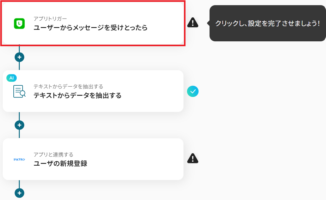 「LINEで特定メッセージが投稿されたら、ジョブカン経費精算・ワークフローでユーザーを登録する」フロー。LINEの特定投稿をトリガーにジョブカン経費精算・ワークフローへの登録を自動化し手間を削減できます。