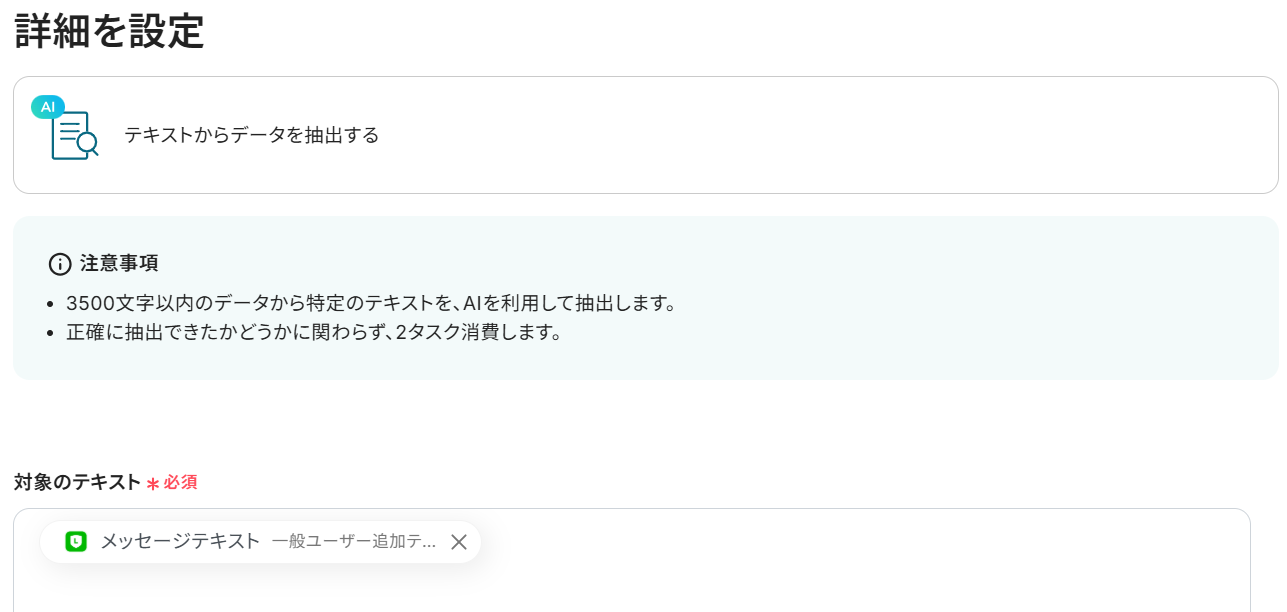 ステップ3と同様、アクションは「GPT-4o mini|3,500文字以内のデータからテキストを抽出(2タスク)」のまま「次へ」をクリックしましょう。