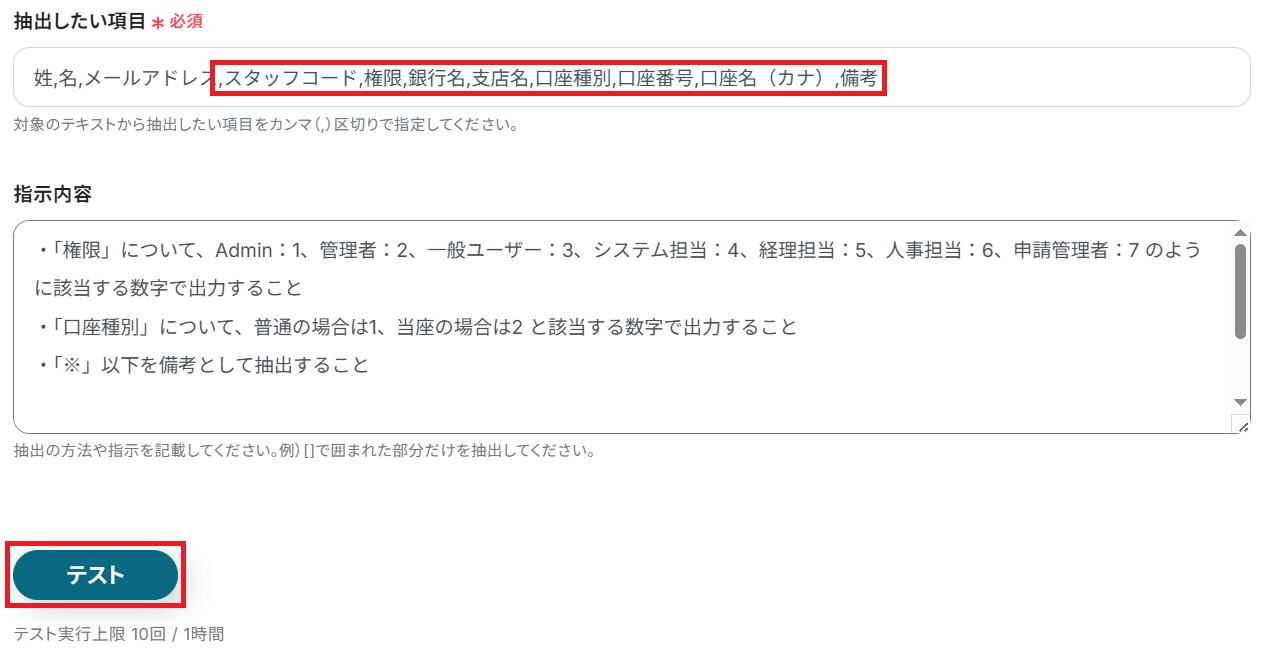 抽出したい項目も予め設定されていますが、編集・追加する場合は以下の赤枠のようにカンマ区切りで入力します。