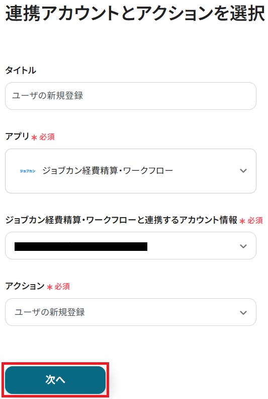 ステップ3と同様、アクションは「ユーザの新規登録」のまま「次へ」をクリックしてください。